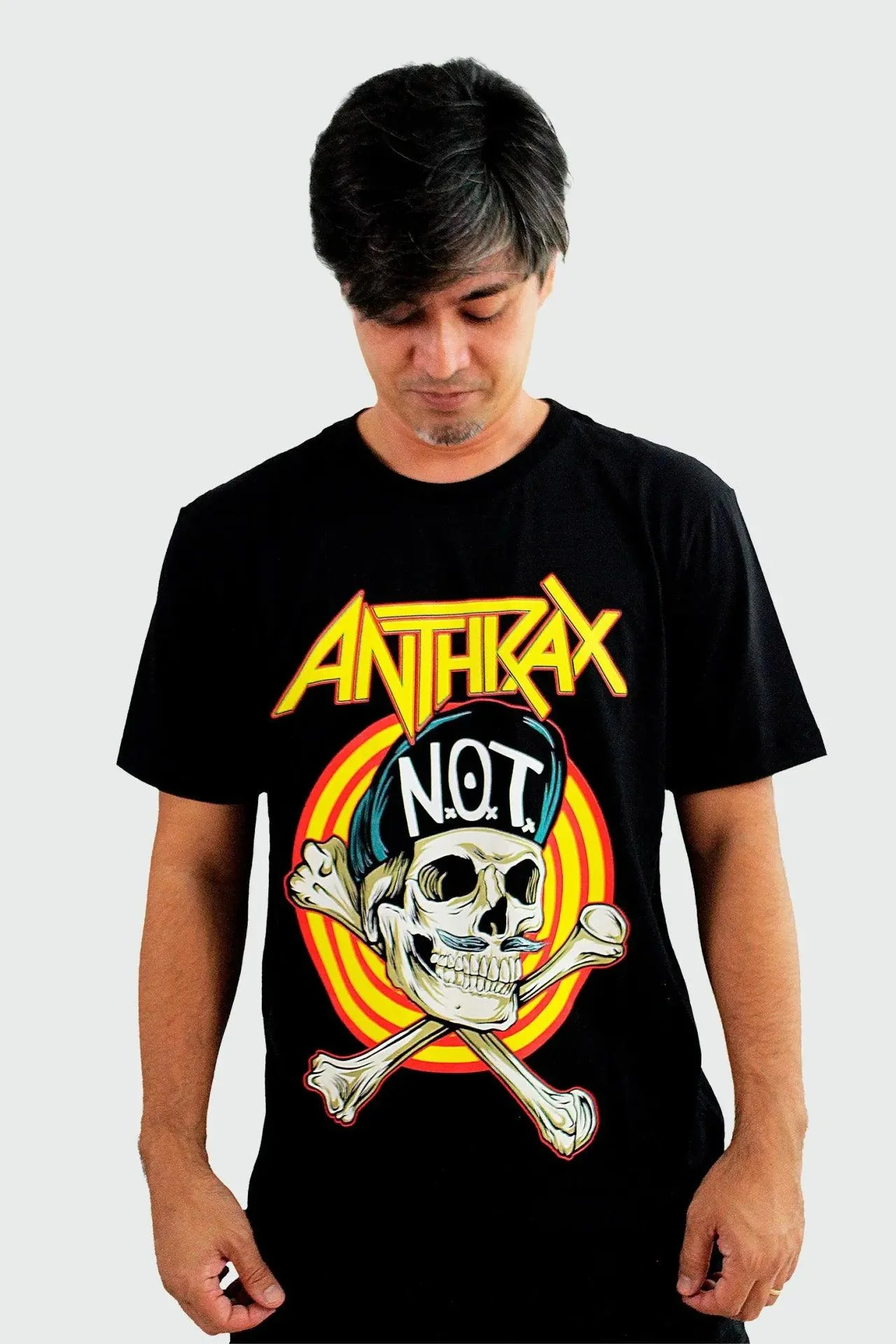 O "Not Man" é um dos mascotes icônicos da banda de thrash metal Anthrax. Ele é uma representação distinta de um alienígena humanoid baseado no personagem "Not Man" de sua música "I Am the Law", inspirada no juiz Dredd das histórias em quadrinhos. Esta estampa, que mescla símbolos do rock e da banda, substitui o mascote original por uma caveira. Apresentada em tons vibrantes, predominantemente de amarelo e laranja, contrastando com uma camiseta preta 100% algodão e gola careca, esta estampa destaca-se como uma afirmação audaciosa do estilo e da atitude característicos do Anthrax.