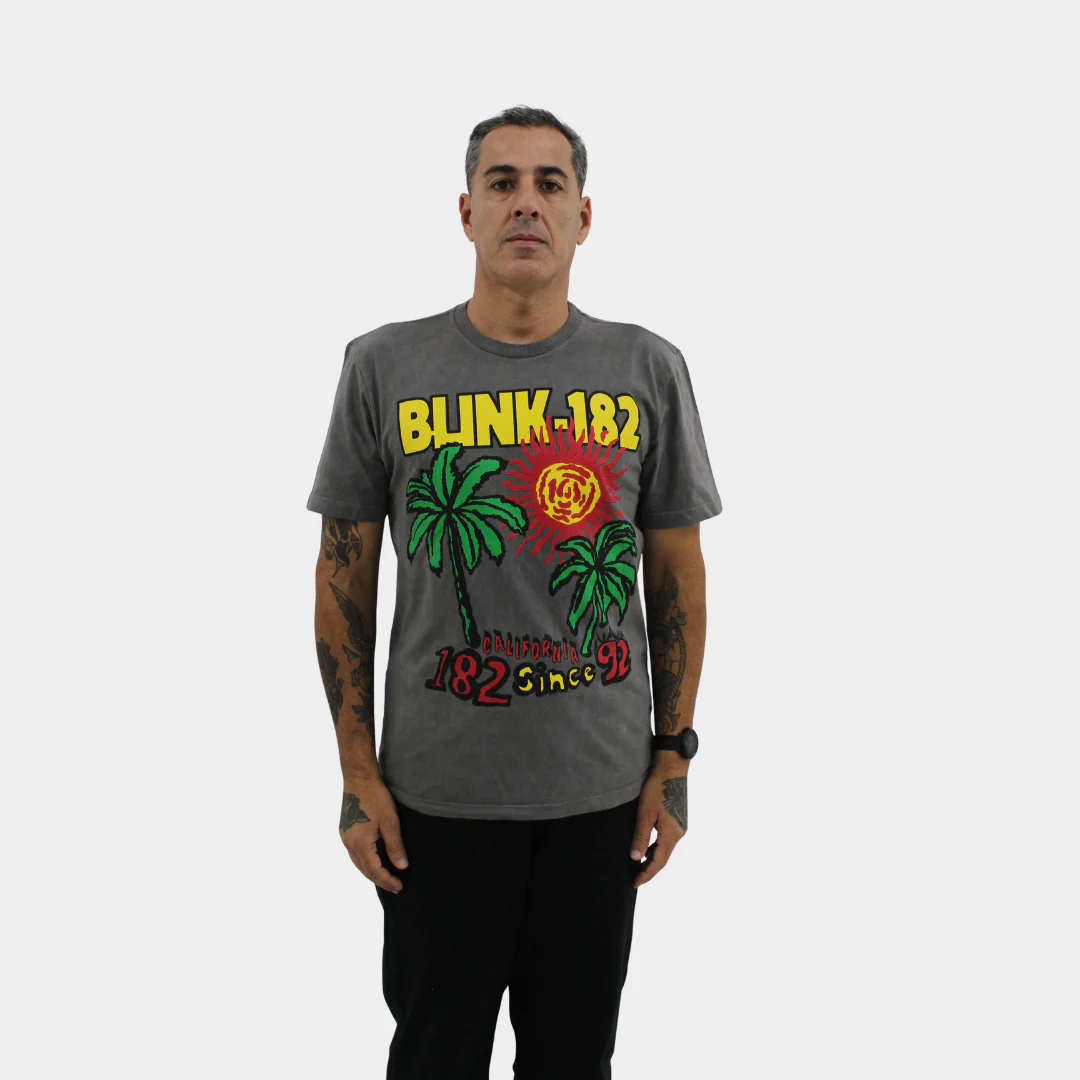 Celebre as origens do Blink-182 com a Camiseta Oficial California Since 92, disponível no Consulado do Rock. A peça traz uma arte cheia de personalidade, com palmeiras verdes, um sol estilizado em vermelho e amarelo e o logo da banda em destaque, tudo em referência às raízes da banda no Sul da Califórnia. Nas costas, o nome "Blink-182" aparece em letras grandes e amarelas. O tecido cinza recebe um tratamento especial de lavagem mineral, que deixa cada peça com um visual desgastado e vintage, único do início ao fim.